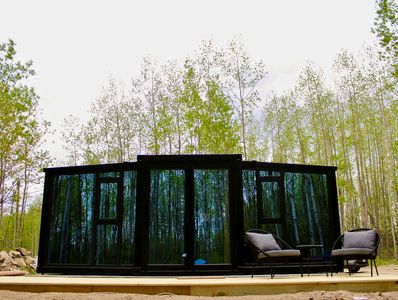 With a wall of reflective glass facing the East, this newly built shipping container modern cabin is made for watching the sunrise. Every detail is thoughtfully designed with a nod to the 70s.